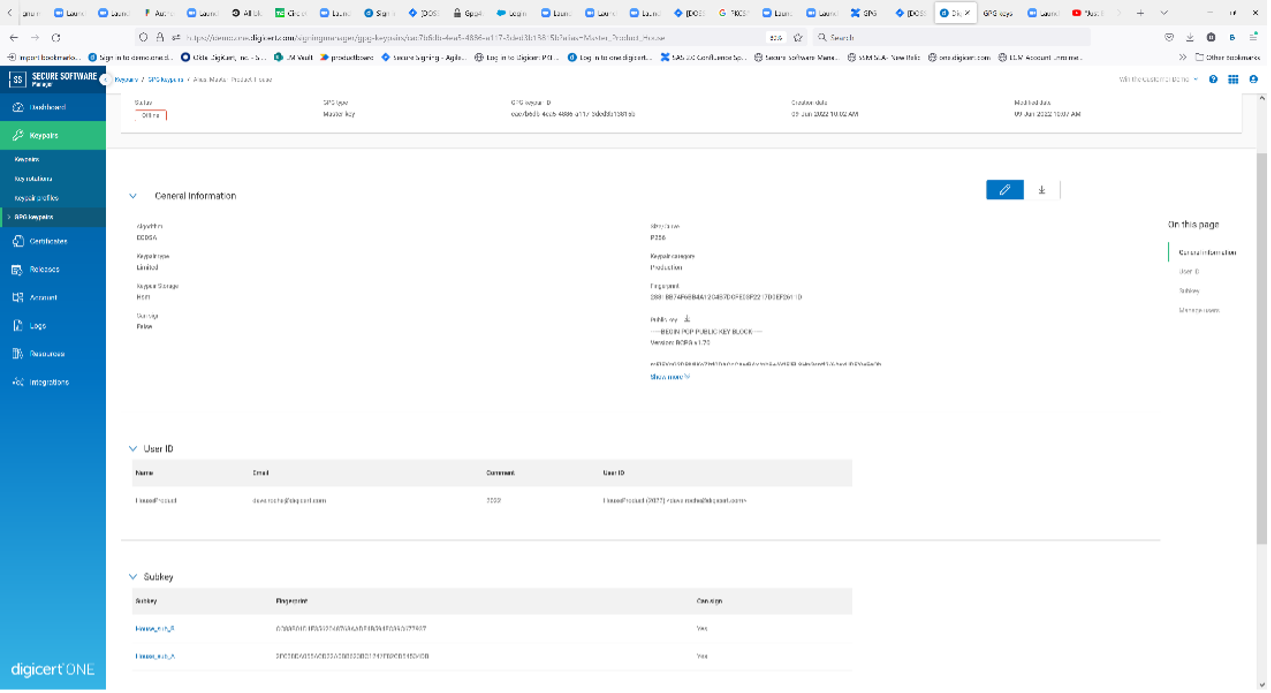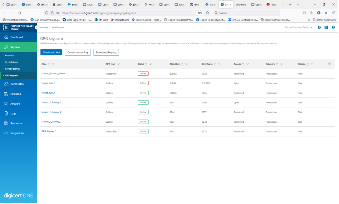First, we have introduced native support for the GPG Keyring in DigiCert Software Trust Manager (DSTM). GPG keys are different from standard keypair because each GPG key includes a master key and associated subkeys. The GPG Keyring therefore has a hierarchical structure of its own where the keys are related rather than relying on a certificate hierarchy. While there are no technical differences between a master key and subkey, the responsibilities of these keys remain separate to enhance security.