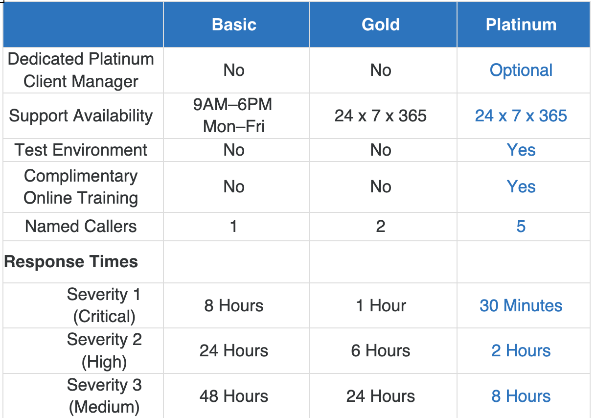 Furthermore, Platinum Support customers receive the highest service levels for availability, delivery and response, 24/7, 365 days a year.