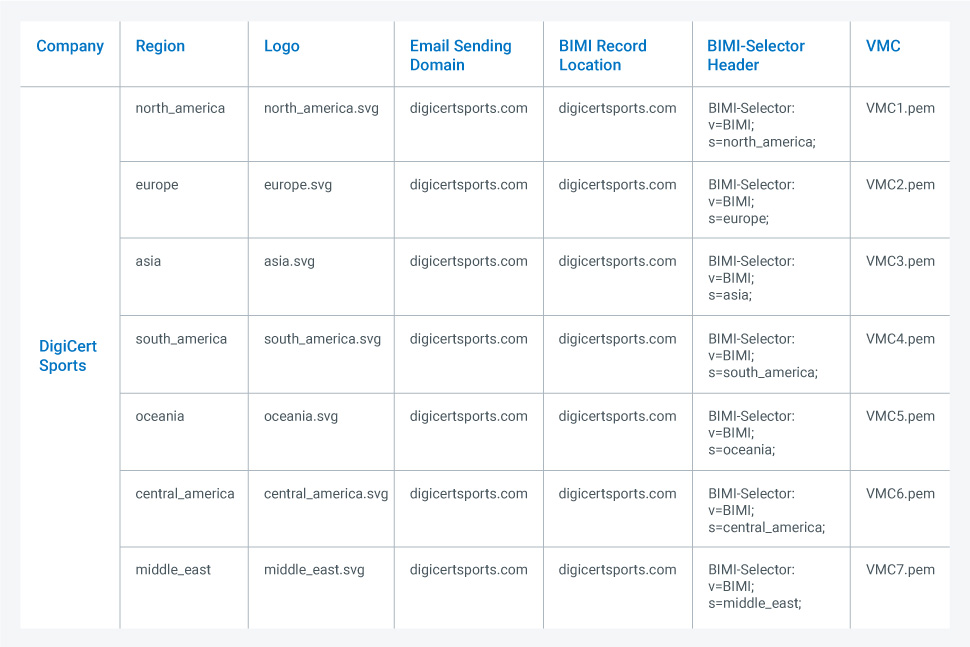 To show you what we mean, we’ve invented a retailer called DigiCert Sports. This fictional sports company has seven different logos that are all associated with the same email-sending domain. DigiCert Sports uses BIMI selectors to display the appropriate logo based on the customer’s region.
