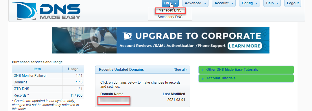 After logging in, hover over the blue DNS tab at the top of the screen and select Managed DNS. Alternatively, you can click on any domain in the Recently Updated Domain List (if any).