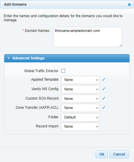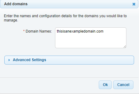 The process for adding a domain is the same for this step, but instead of clicking OK after entering your domain in the domain field, click on Advanced Settings.