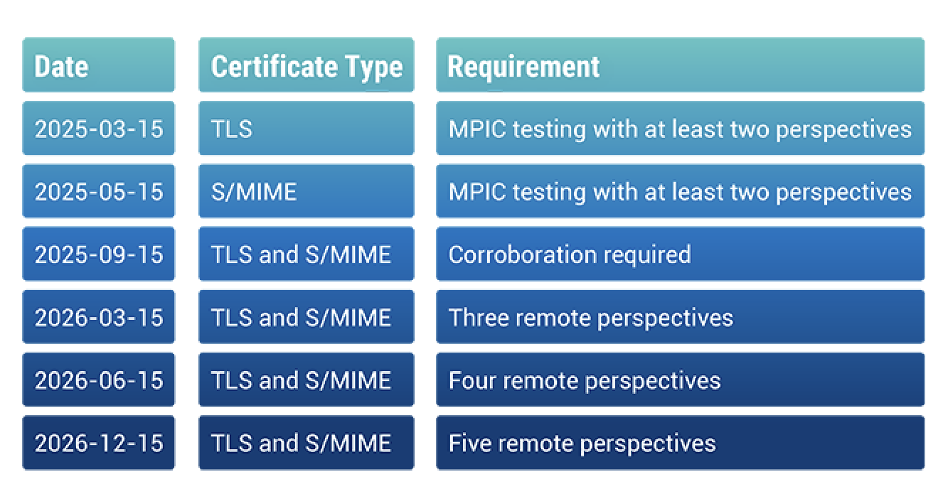 To give the industry time to adapt, the CA/Browser Forum is rolling out MPIC in phases. Early deadlines focus on testing and observability, with enforcement ramping up over time. Starting in September 2025, certificate issuance will require corroboration, aka consistent validation results from multiple independent network perspectives.