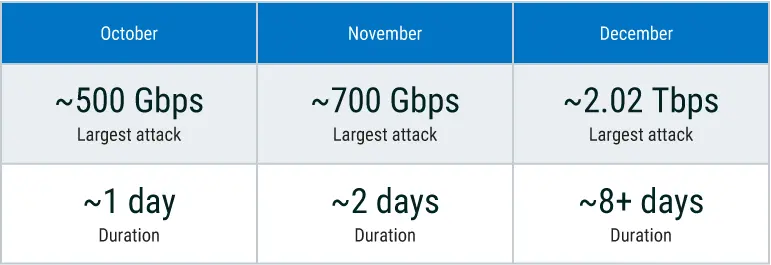 After relatively contained activity in October and November, December marked a step-change. Total attacks more than doubled month over month, peaking at 2,200 events, while mega attacks (100+ Gbps) increased sharply. The largest observed attack reached 2.02 Tbps, firmly establishing terabit-scale DDoS as an active, not theoretical, threat.