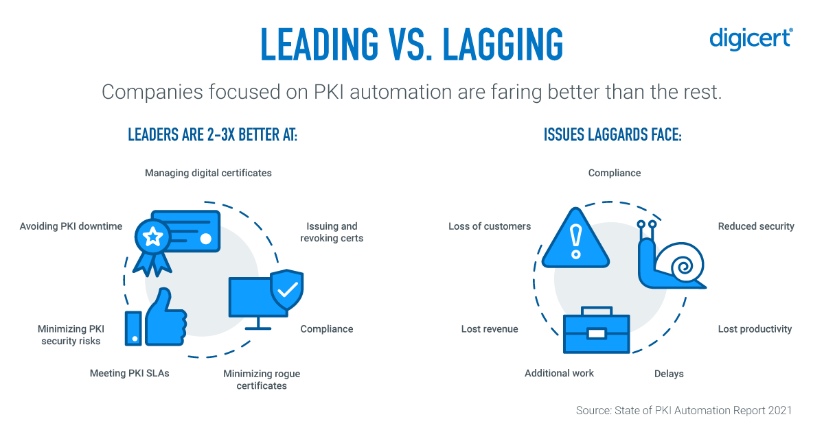 By contrast, laggards lack in at least two to four of those categories. They experience penalties for their lack of skill in managing PKI certificates. These outcomes include compliance issues, security issues, lost productivity, delays, lost customers, lost revenue and a state of being overworked.