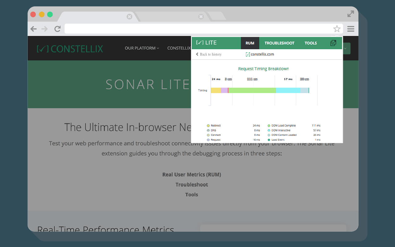 But what if you want to see from your end-users’ perspective? As we mentioned earlier, there are many different hops between your end-users and your authoritative name server. While these may be difficult (if not impossible) to control, it’s important to keep an eye on them. This way you can rule out your own service providers as a source of latency or service disruption. Constellix Sonar recently introduced their own Real-User Monitoring tool, which allows you to see all the factors that contribute to network and web performance such as: