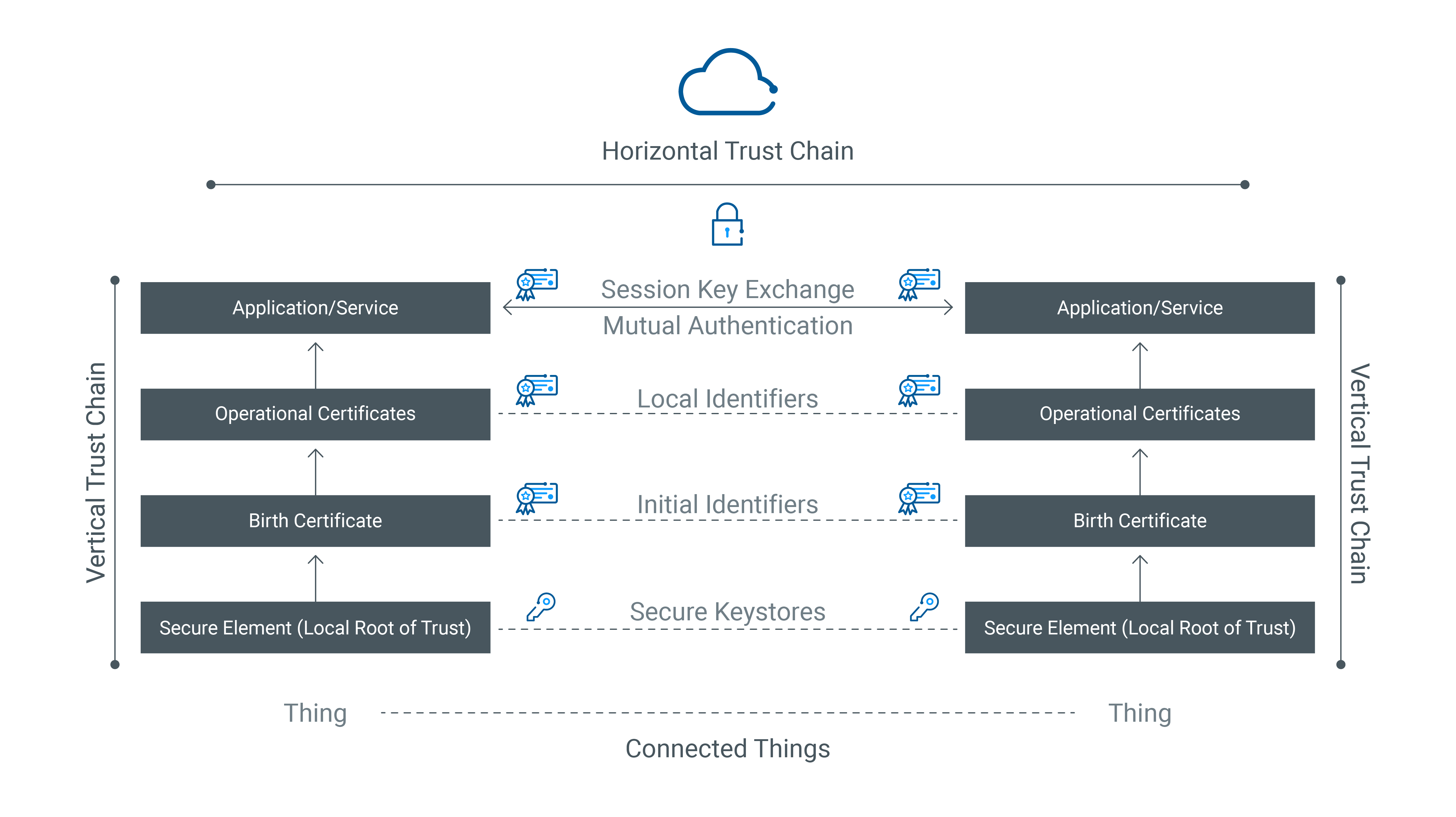 So where does the notion of zero trust begin? This brings us to the difference between implicit and explicit trust, and transfer of trust (or transitive trust). Trust is a chain. Trust transfers from a root of trust at the local peer, establishing a vertical chain of trust, and bridges across a horizontal chain of trust to the remote peer. Trust begins with trusted identities and must persist throughout the lifecycle of connected things.