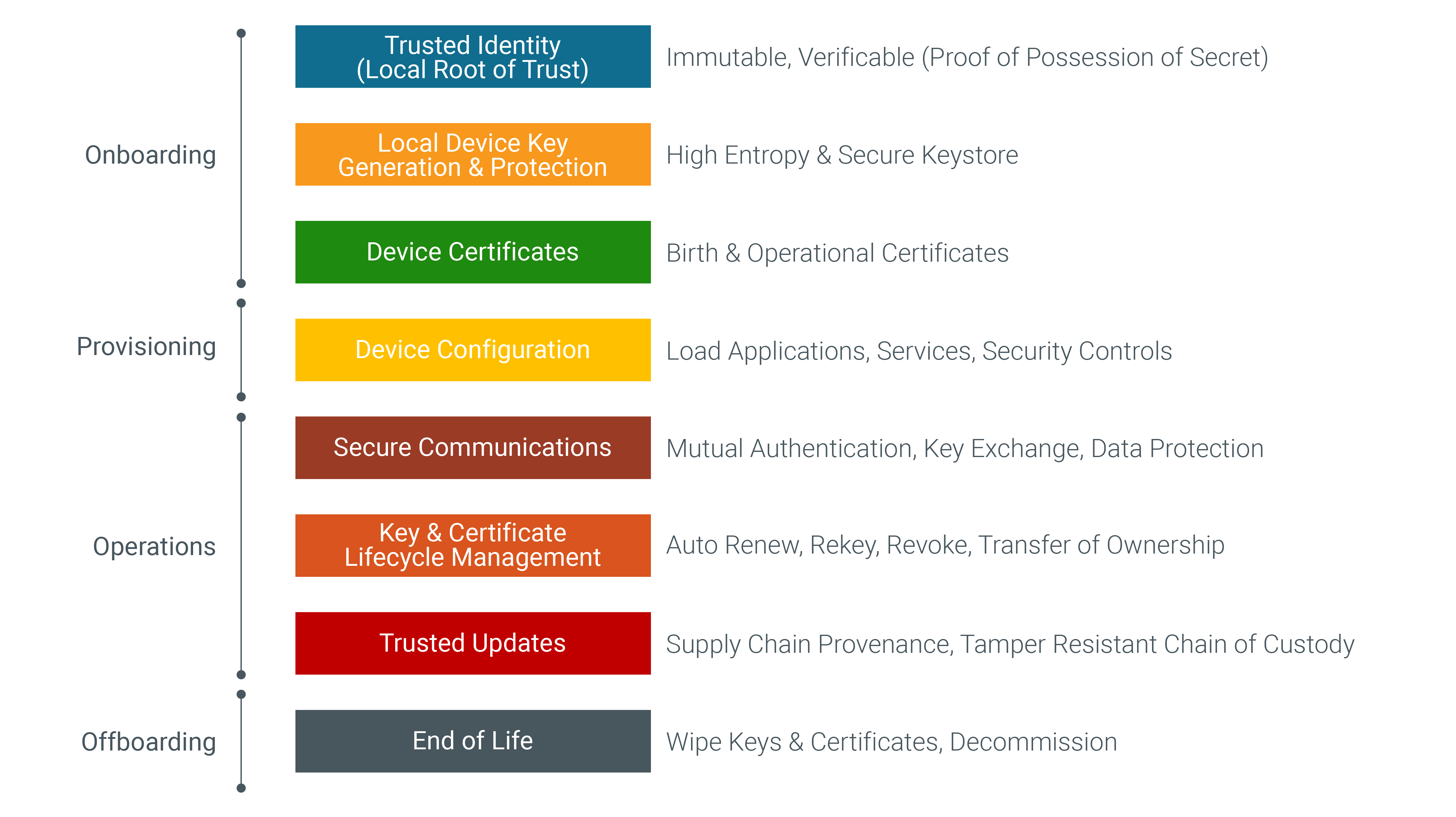 All good things must retire someday. The risks posed by abuse of cryptographic artifacts necessitates a wipe of keys and certificates on the device as a decommissioning ceremony. That is what zero trust is all about. It is the fusion of explicit trust with transitive trust that persists throughout the lifetime of device operations. Trust is established at the door, but zero trust is measured beyond the door.