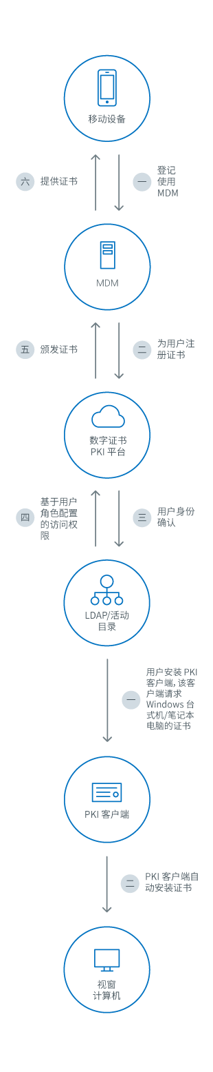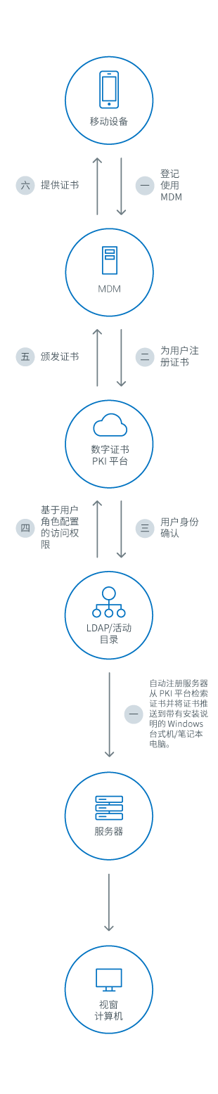 DigiCert® Enterprise PKI Manager 保护您的数据、电子邮件和应用程序,并让您通过一个管理点完全控制整个UEM/MDM环境。无论您部署什么—无论您的员工带来什么—PKI都提供受信任的加密和身份。