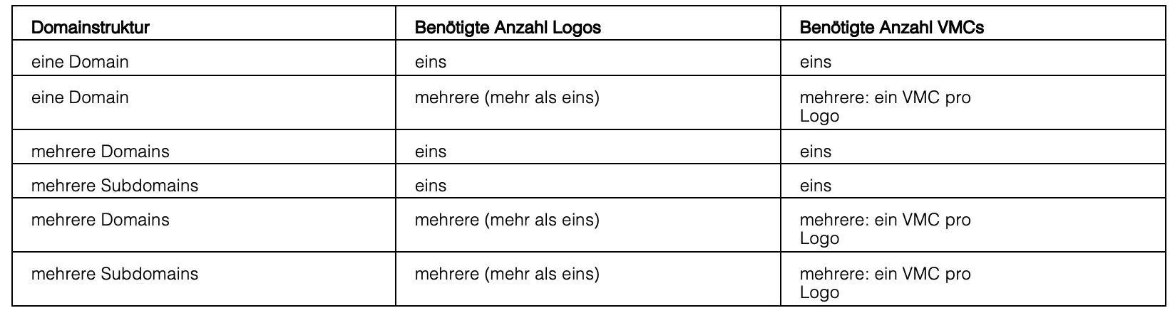 Ich habe mehrere E Mail-Subdomains mit jeweils einer eindeutigen E Mail-Adresse. Ich verwende für alle das gleiche Logo. Wie viele VMCs brauche ich in diesem Fall?