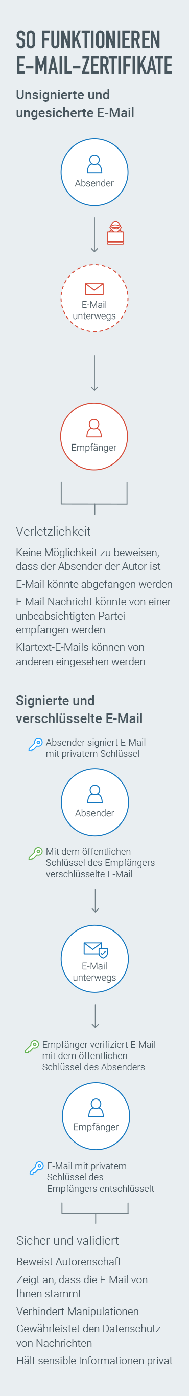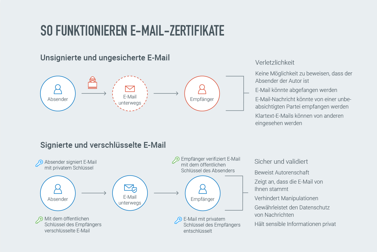 In vielen Unternehmen ist die E-Mail-Kommunikation das schwächste Glied in der Sicherheitskette. Aber genauso wie Websites und Banktransaktionen müssen auch E-Mails auf ihrem Weg vom Absender zum Empfänger geschützt werden. PKI-Zertifikate sind eine bewährte Verschlüsselungs- und Authentifizierungsmethode, die nicht nur den Inhalt der Nachricht schützt, sondern auch die Identität des Absenders nachweist.