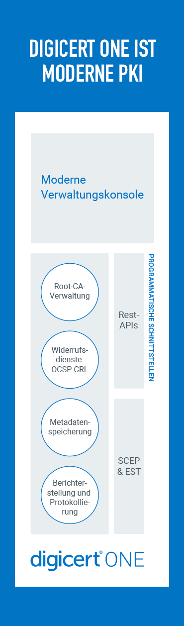 DigiCert ONE umfasst eine Reihe moderner PKI-Verwaltungstools („Manager“), die in einer leistungsstarken Plattform bereitstehen. Diese Plattform lässt sich schnell bereitstellen und individuell konfigurieren.