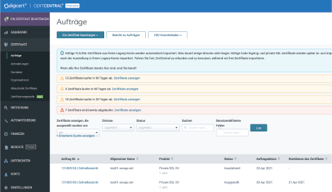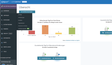 Richten Sie den Cursor in der linken Menüleiste Ihres CertCentral-Kontos auf „Certificates“ (Zertifikate) und klicken Sie dann auf „Orders“ (Bestellungen).