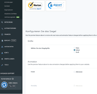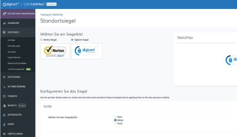 Wählen Sie als Nächstes das Siegel, das Sie auf Ihrer Website anzeigen wollen, sowie die passende Größe (klein, mittelgroß, groß). Rechts erhalten Sie eine Vorschau des ausgewählten Siegels.