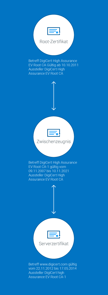 Die folgende Grafik illustriert die so genannte Zertifikatskette. Auf diese Weise wird Ihr Serverzertifikat über ein Zwischenzertifikat mit dem Root-Zertifikat der CA (in diesem Fall DigiCert) verknüpft.