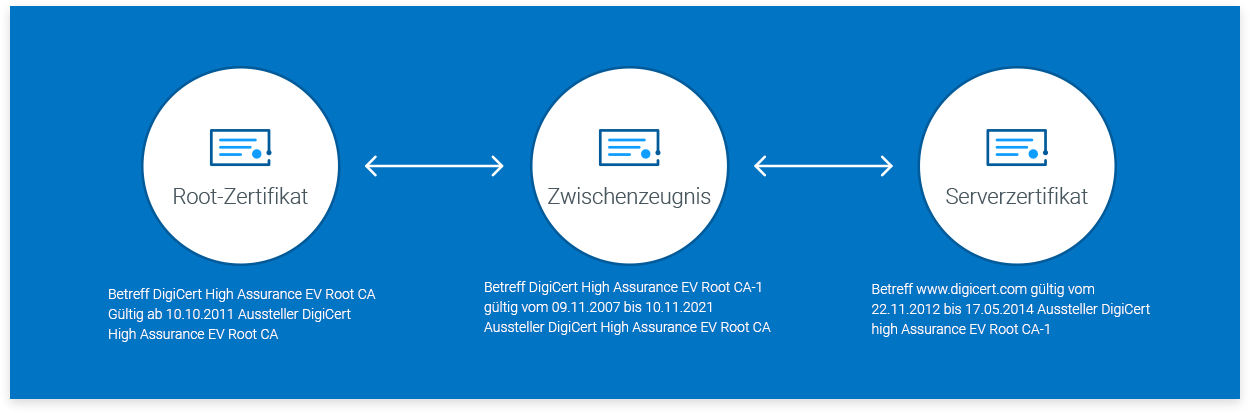 Das Wichtigste an einem SSL-Zertifikat ist, dass es von einer vertrauenswürdigen CA wie DigiCert digital signiert ist. Ein Zertifikat kann jeder erzeugen, aber ein Web-Browser vertraut nur Zertifikaten, die von einer Organisation auf seiner Liste vertrauenswürdiger CAs stammen. In jedem Browser ist eine Liste vertrauenswürdiger CAs vorinstalliert, die so genannten „vertrauenswürdigen Stammzertifizierungsstellen“. Um in diese Liste aufgenommen und als Zertifizierungsstelle anerkannt zu werden, muss ein Unternehmen dem von den Browsern festgelegten Sicherheits- und Authentifizierungsstandards entsprechen und sich einem Prüfverfahren unterziehen.
