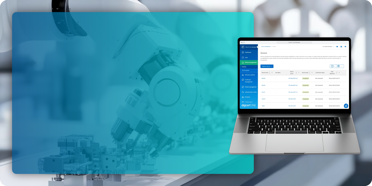 DigiCert Device Trust Manager is an industry-leading solution delivering comprehensive IoT trust to address device manufacturing challenges. With DigiCert Device Trust Manager, you can easily build strong security and updating capabilities into your device, speed time to market, and maintain regulatory compliance.