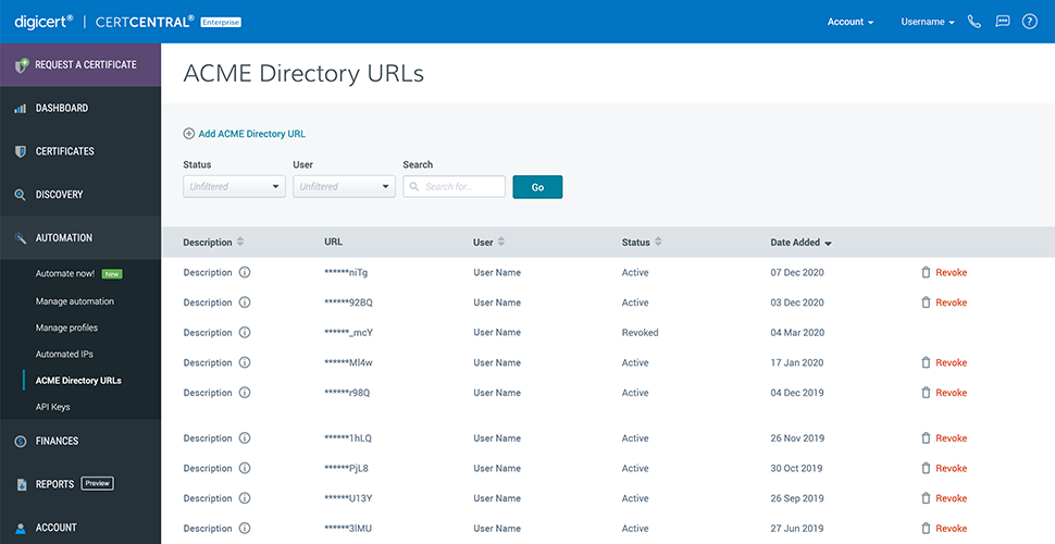 CertCentral® de DigiCert ofrece varias maneras de configurar la automatización (p. ej., mediante el protocolo ACME, con herramientas de automatización o a través de API). Su interfaz de usuario permite gestionar varios clientes de ACME que se ejecuten en servidores Windows y Linux, de modo que cualquier empresa pueda disfrutar de funciones de automatización básicas. Además, las API permiten integrar CertCentral con el sistema o la plataforma de su elección, lo que ofrece una flexibilidad y unas posibilidades de personalización ilimitadas. Por último, en lo que respecta a funciones de automatización escalables y gestionadas, DigiCert ofrece un conjunto de herramientas de automatización para empresas que se integran a la perfección con otras soluciones de OEM, como las de F5, Amazon AWS, Citrix y otros fabricantes, y con los balanceadores de carga más usados.