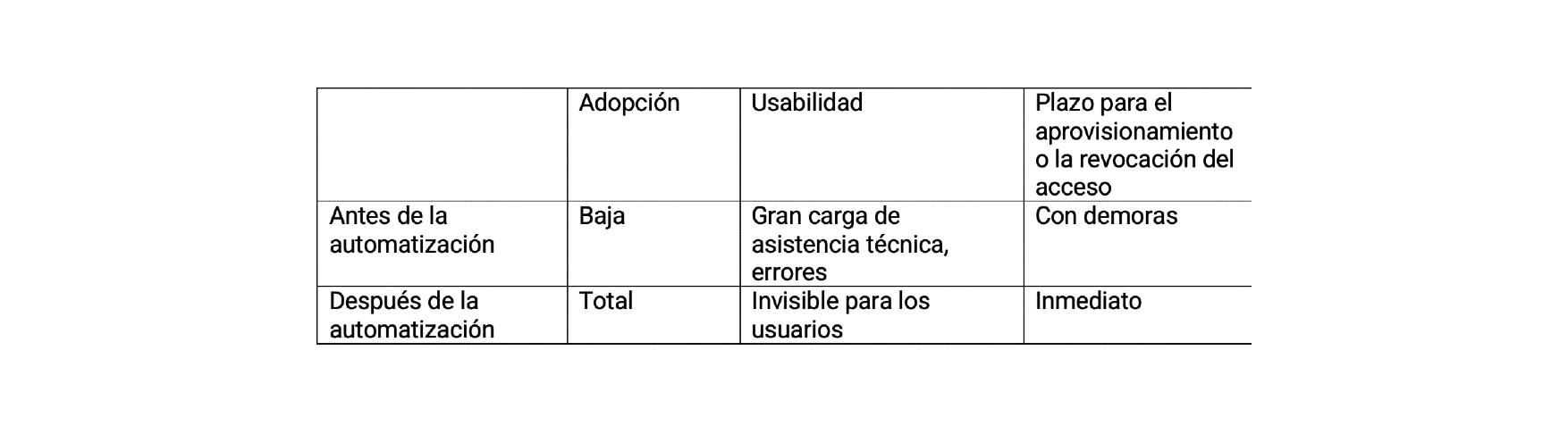Cómo abordar esta cuestión: Los profesionales de TI consideran que la automatización es una estrategia clave para abordar los asuntos relacionados con la adopción, la usabilidad y la seguridad. La automatización puede hacer que el aprovisionamiento y la gestión de las credenciales sean procesos invisibles para los usuarios finales y que se lleven a cabo de manera sencilla durante la incorporación o la desvinculación de los empleados, lo que mejora las tasas de adopción, reduce la carga de asistencia técnica y elimina los problemas de aprovisionamiento.