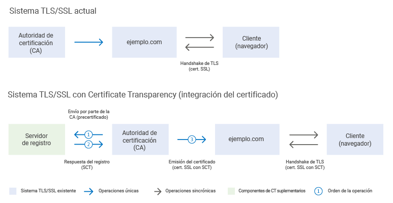 El marco CT funciona dentro del sistema existente de CA de confianza pública. Con CT, las CA pueden incluir pruebas de la emisión de certificados en un registro público y los navegadores pueden comprobar estas SCT durante el proceso de handshake. El registro de certificados, que es una prueba del correcto funcionamiento de la CA, proporciona información sobre las operaciones de la CA.