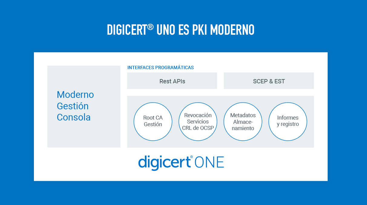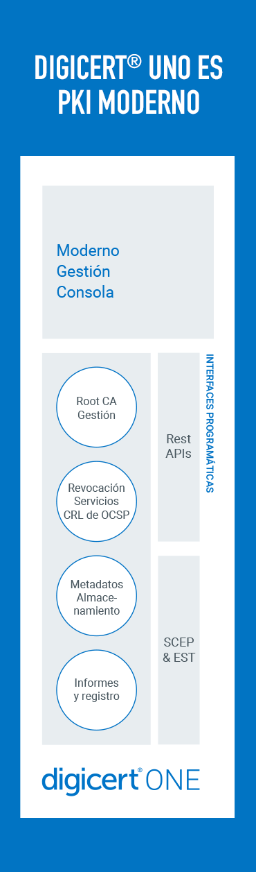 DigiCert ONE es un conjunto de gestores de PKI modernos distribuidos en una eficaz plataforma que se ha diseñado para poder implementarse con rapidez y con la configuración adecuada según sus necesidades.