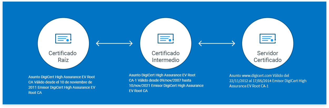 En la siguiente imagen, mostramos lo que se denomina «cadena de certificados», que conecta el certificado del servidor con el certificado raíz de la CA (en este caso, DigiCert) mediante un certificado intermedio.