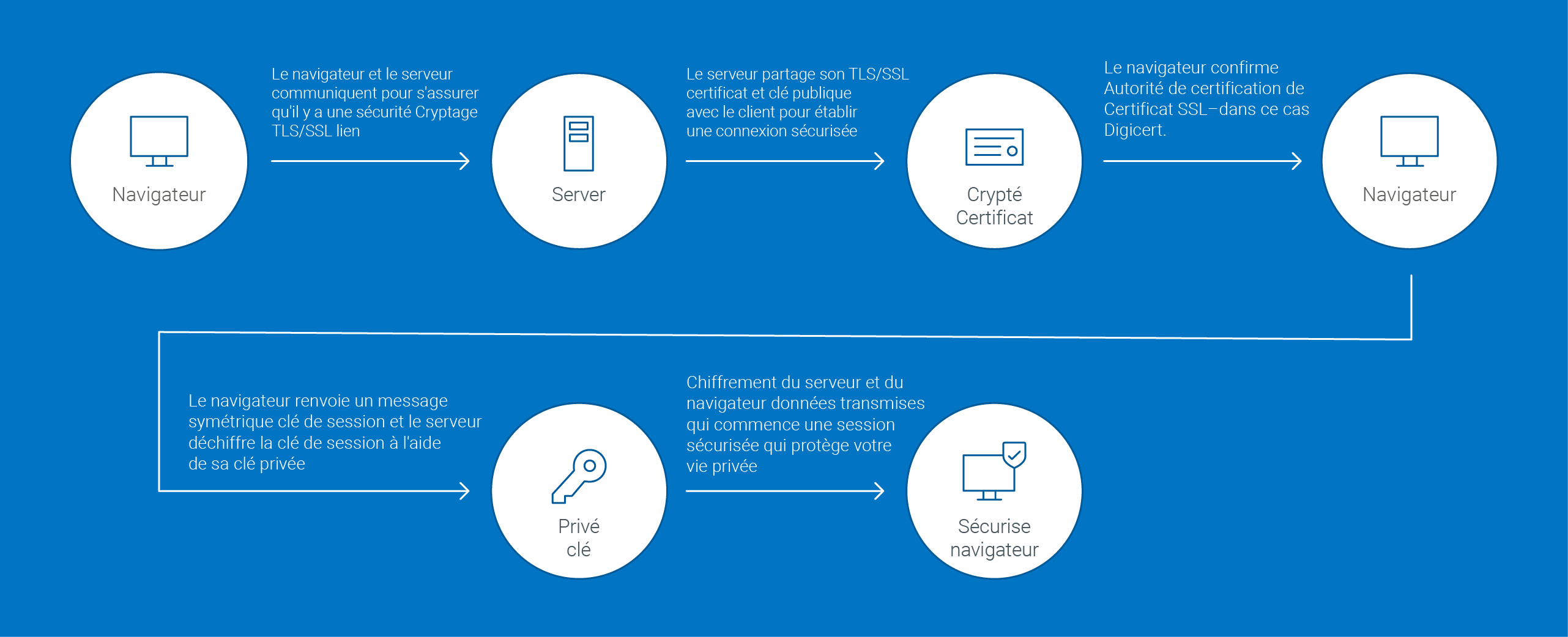 Invisible pour l’utilisateur, un processus appelé « négociation TLS/SSL » (TLS/SSL handshake) crée une connexion protégée entre votre serveur et votre navigateur de façon quasi instantanée à chaque fois que vous visitez un site web. Un site web sécurisé par un certificat TLS/SSL affiche le préfixe « https » et une icône en forme de cadenas dans la barre d’adresse du navigateur. Les certificats TLS/SSL ont un double emploi: protéger les données utilisateurs en transit et authentifier l'entité derrière le domaine pour garantir aux internautes qu'ils interagissent bien avec le propriétaire légitime du site web visité.