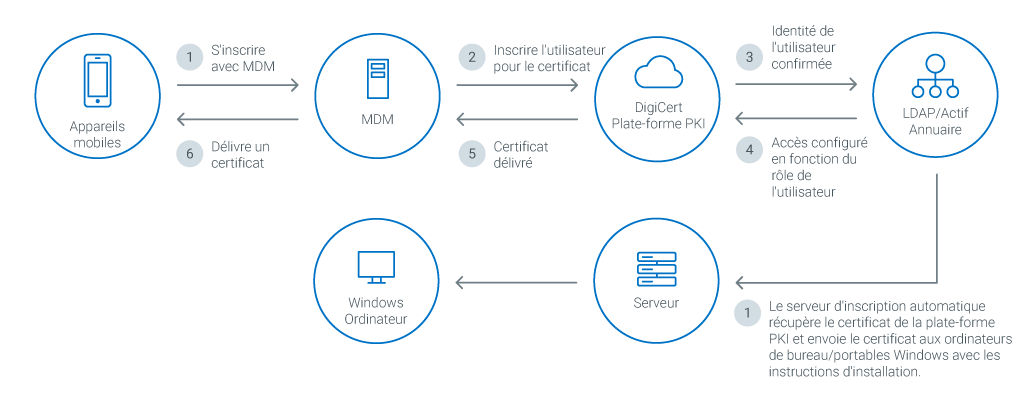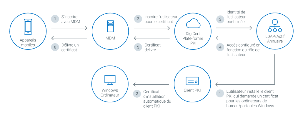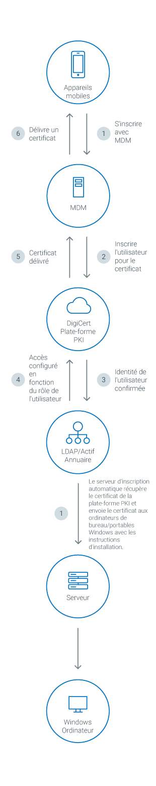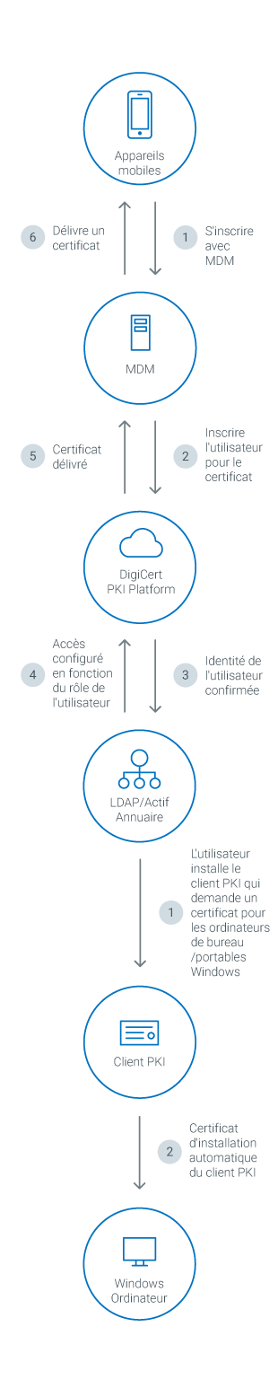 DigiCert® Trust Lifecycle Manager protège vos données, vos e-mails et vos applications. Notre plateforme centralisée vous offre un contrôle complet sur l’ensemble de votre environnement UEM/MDM. Quelle que soit la nature de vos déploiements—et quels que soient les appareils de vos collaborateurs—l’infrastructure PKI offre une gestion des identités et un chiffrement éprouvés.