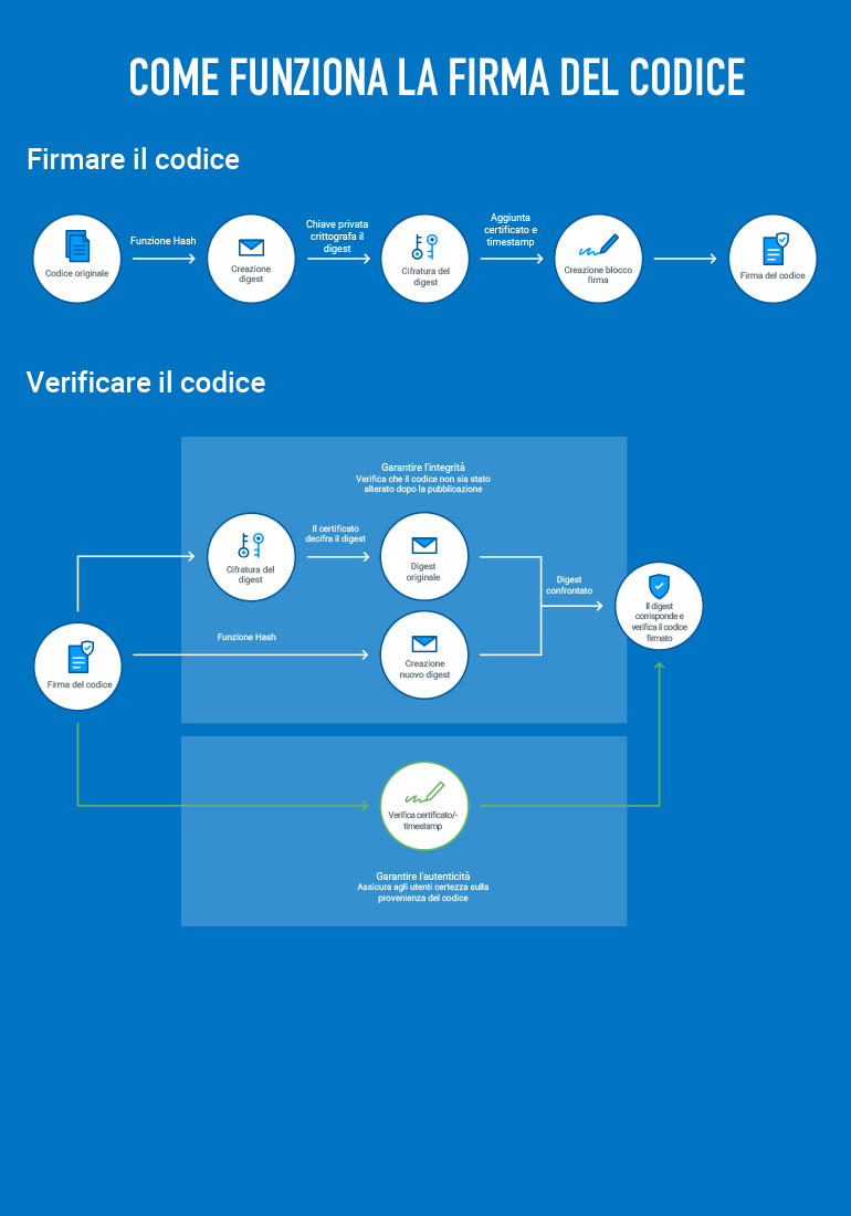 Come per altre tecnologie PKI, la firma del codice si basa su una coppia di chiavi pubbliche/private, un'autorità di certificazione e un certificato digitale. Quando un editore firma un software, crea un pacchetto limitato che include il suo software, un certificato di firma del codice e una firma digitale. Il certificato di firma del codice contiene l'identità e la chiave pubblica dell'editore, oltre alla firma della CA che conferma che quest'ultima ne ha verificato l'identità. La firma digitale è l'hash firmato del software che utilizza la chiave privata dell'editore. Dopo il delivery del software, l'agente dell'utente verifica la validità e l'integrità del certificato (stabilendo se il software è stato modificato dopo la firma). Per farlo, utilizza la chiave pubblica del certificato e decodifica l'hash della firma digitale. Quindi confronta l'hash della firma digitale con l'hash calcolato di recente dal software. Se gli hash coincidono, il cliente o l'utente ha la certezza che il software non è stato alterato. La gestione delle chiavi private è un elemento di sicurezza fondamentale per la firma del codice. Se la chiave viene rubata o gestita in modo errato, i criminali informatici possono utilizzarla per firmare codice malevolo e distribuirlo ai sistemi di sviluppatori o clienti sotto forma di aggiornamento.