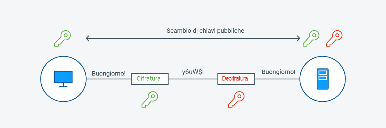 La crittografia asimmetrica non ha questo problema. Finché la tua chiave privata rimane segreta, nessuno può decifrare i tuoi messaggi. Puoi distribuire la chiave pubblica corrispondente senza preoccuparti di chi la riceve. Chiunque sia in possesso della chiave pubblica può cifrare i dati, ma solo chi possiede quella privata può decifrarli.