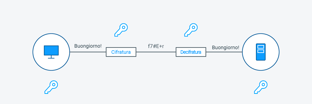La cifratura simmetrica (o crittografia a chiave precondivisa) utilizza un'unica chiave per cifrare e decifrare i dati. Per comunicare, sia il mittente che il destinatario hanno bisogno della stessa chiave. Le dimensioni delle chiavi simmetriche sono in genere di 128 o 256 bit: maggiore è la dimensione della chiave, più difficile è decifrarla. Per esempio, una chiave a 128 bit ha 340.282.366.920.938.463.463.374.607.431.768.211.456 possibilità di codifica. È chiaro quindi che un attacco "a forza bruta" (in cui un aggressore prova tutte le combinazioni possibili fino a trovare quella giusta) richiederebbe diverso tempo per violare una chiave a 128 bit. L'utilizzo di una chiave a 128 o 256 bit dipende dalle capacità di crittografia del server e del software client. I certificati TLS/SSL non stabiliscono la dimensione della chiave da utilizzare.