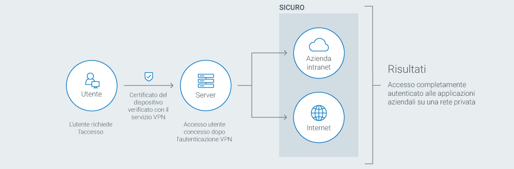 Riduci i rischi abilitando la VPN con la convalida dell'identità per i dispositivi endpoint. Stai tranquillo sapendo che ogni punto della rete è protetto da una piattaforma che consente di gestire in modo efficiente l'accesso degli utenti a un'ampia gamma di dispositivi e sistemi connessi.