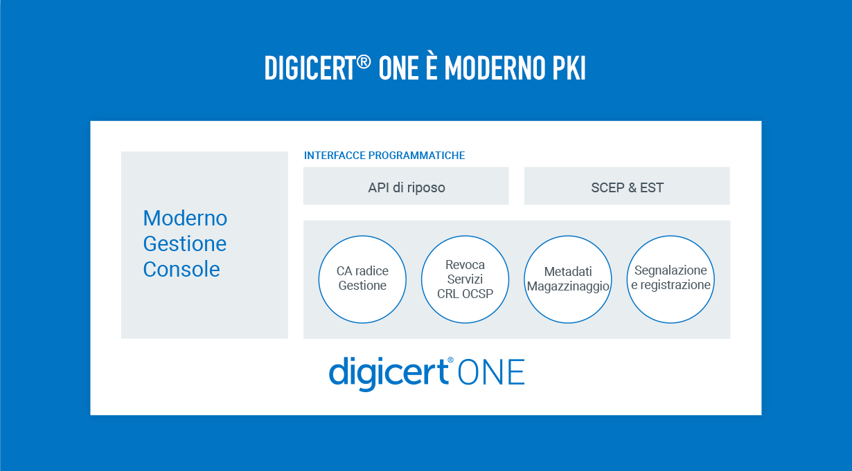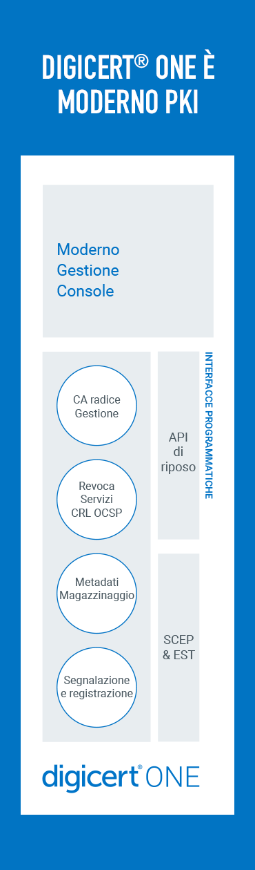 DigiCert ONE è una suite di moderni manager PKI forniti in una piattaforma efficace e concepita per una distribuzione rapida con una configurazione adatta alle tue esigenze.