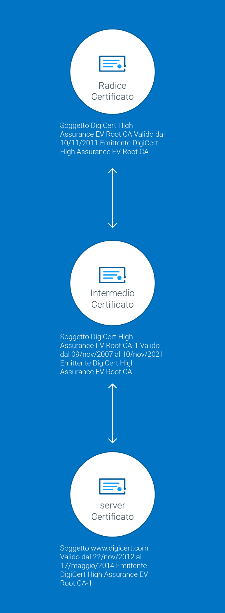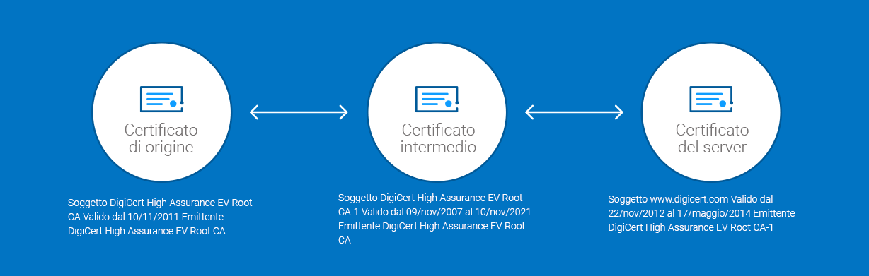 L'immagine qui sotto mostra la cosiddetta catena di certificazione. Questa collega il certificato del tuo server al certificato radice della CA (in questo caso DigiCert) mediante un certificato intermedio.