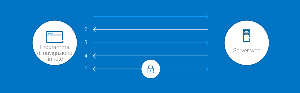 Quando un browser cerca di accedere a un sito web protetto da SSL, il browser e il server stabiliscono una connessione SSL con un processo denominato "SSL handshake" (vedi il diagramma qui sotto). L'SSL handshake è invisibile all'utente e avviene in modo istantaneo.