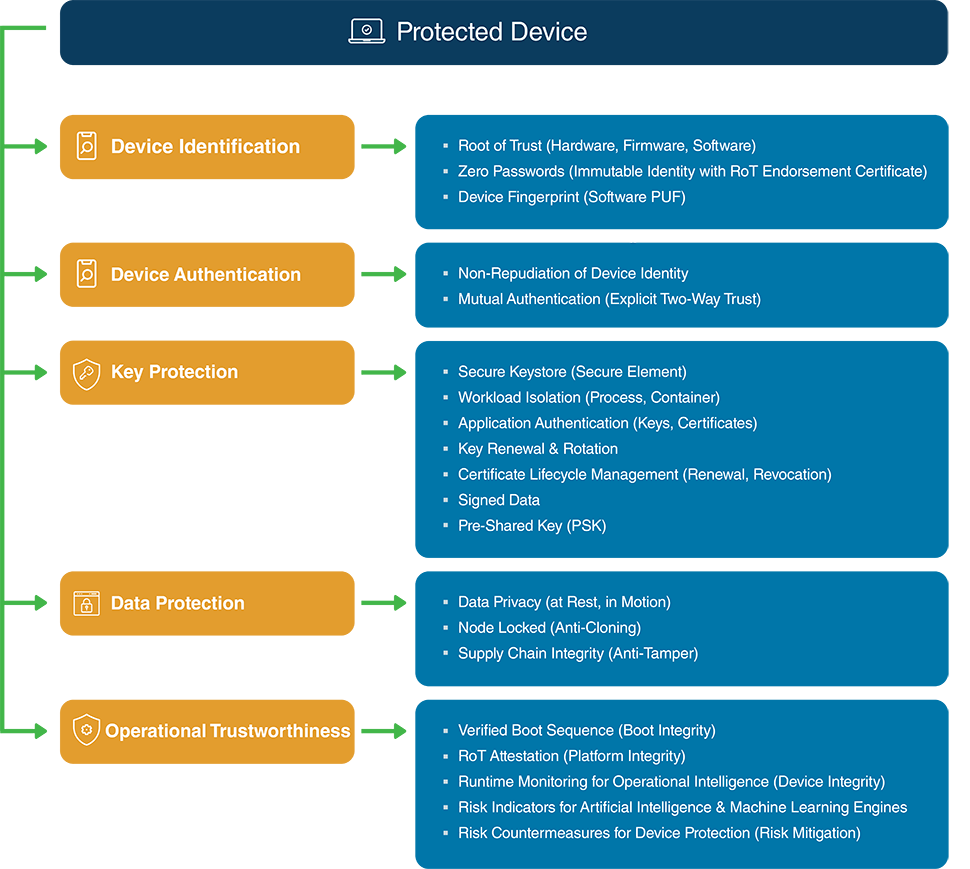 デバイス保護は、デバイスの識別、デバイスの認証、鍵の保護、データの保護、運用の信頼性という 5 つの柱から成るリスク対策に基づいています。信頼できるデバイスに対してリスク対策を実施することは、IoT エコシステムの主な関係者にとって、イノベーションのコストをはるかに上回るものとなります。