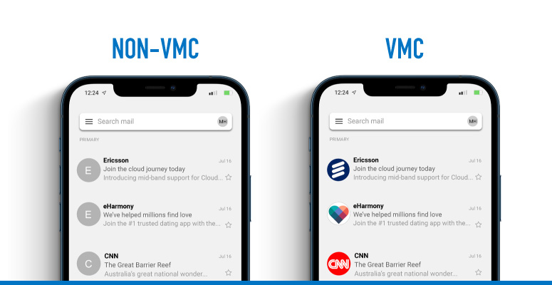 受信トレイに表示されるブランドロゴは、送信者が DMARC と VMC の強力なセキュリティおよび認証要件を満たしていることを示す視覚的な指標。
