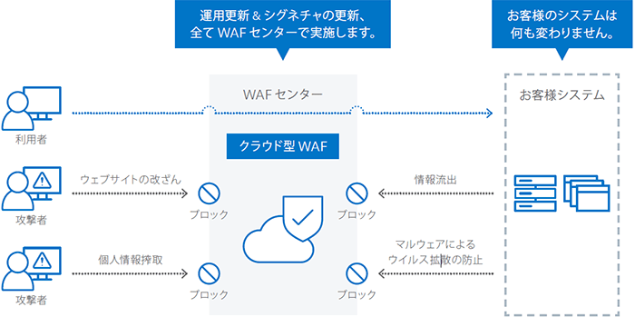 新たな脆弱性に対する攻撃をブロックする為に必要なWAFのシグニチャは全てWAFセンターで管理・運用されているため、お客様の運用負荷が軽減されるだけでなく、WAFセンターで新たに発見された脆弱性に対する攻撃にも対策が素早く適用されます。WAFのシグニチャの適用には、新たな攻撃の理解とその攻撃が自社システムへ与える影響への判断が必要になりますが、クラウド型の場合、その判断を専門家にゆだねることができる上、適用の頻度を多くして検知精度を上げることもできます。そのため、今回のクラウド型WAFの導入によって、ホームページへアクセスするユーザの利便性を損ねることなく、新たなサイバー攻撃をブロックすることが期待できます。