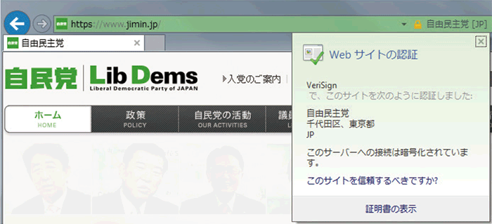 (Internet Explorer 10で見た場合)アドレスバーが緑色になり、「自由民主党」と表示されます。また、アドレスバーにある「南京錠マーク」をクリックすると、そのサイトの認証情報を確認することができます。