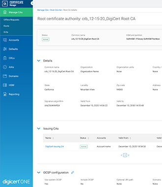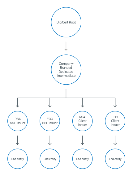 専用中間認証局は発行 CA であり、企業がすべての主要なブラウザとサーバーに信頼される電子証明書を配置することを可能にします。デジサートの専用中間認証局は、証明書の用途と種類をカスタマイズできるため、企業における信頼のチェーンを実装する柔軟性を提供します。