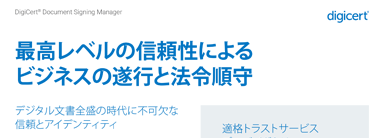 DigiCertは、EU規則No.910/2014 (eIDAS)、UK eIDAS、スイスのZertES、Adobe Approved Trust List (AATL)の要件に準拠し、世界中で安全なビジネス取引を支援します。