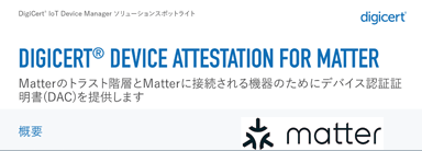 Matter は、スマートホームデバイスに相互運用性、信頼性、使いやすさ、堅牢なセキュリティをもたらします。この世界標準により、Google Home、Amazon Alexa、Apple HomeKitを含むあらゆるプラットフォームやエコシステム上のMatter対応デバイスとの間で、あらゆる相互通信が可能になります。Matterの規格を満たすには、デバイス認証証明書(DAC)を使用してIoT製品を保護する必要があります。