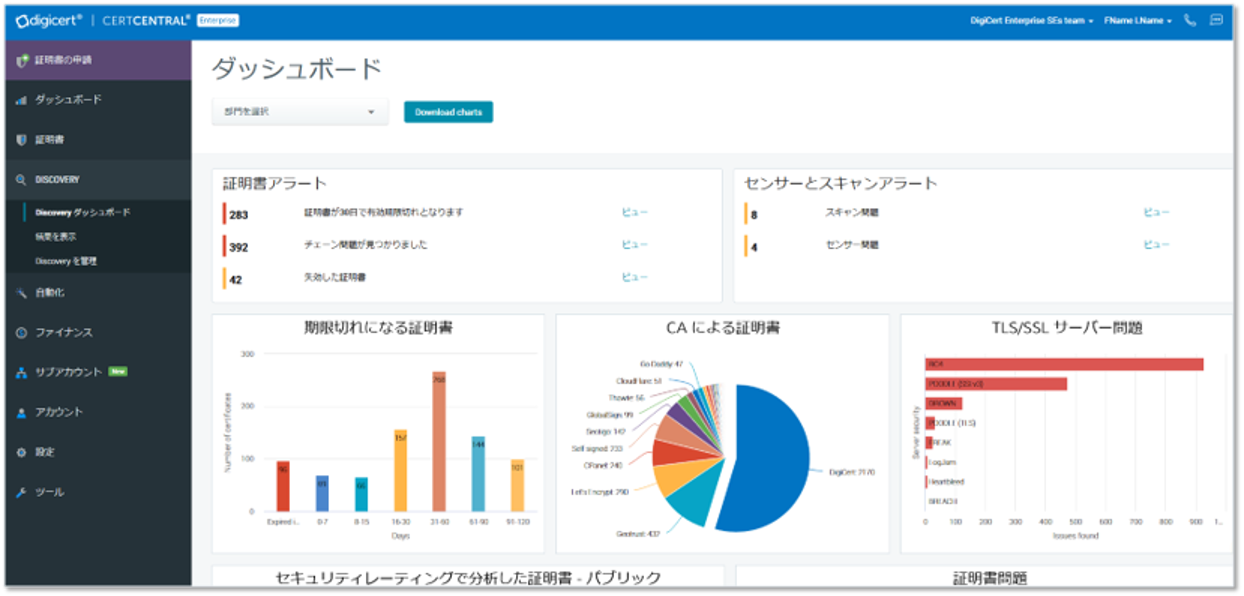 DigiCert CertCentral Enterpriseは最新のツールとテクノロジーによって構成されており、SMB市場向けのDigiCert CertCentralの全機能に加え、エンタープライズ顧客に証明書のセキュリティやコンプライアンスに関する優れた管理性を提供します。組織は常時可視化を行い、大規模なスケールでの迅速なディスカバリー、信頼できる専門的ノウハウを受けることができ、組織の業務や顧客、評判を守るためのガイダンスを得ることができます。DigiCert CertCentral Enterpriseによって、企業はTLS/SSLをはじめとするさまざまなタイプのTLS/SSL証明書のライフサイクル管理のあらゆる段階をカスタマイズして自動化でき、すべての操作を直観的なユーザーインターフェースとAPI両方で行うことができます。