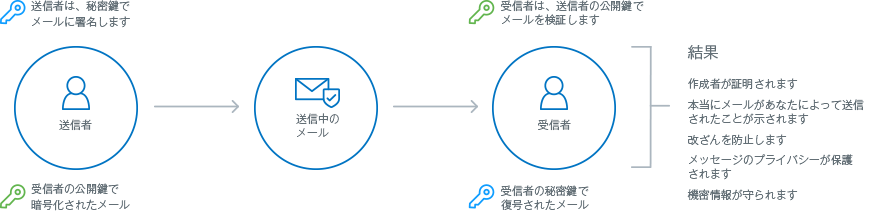 PKI は、フィッシング、スピアメール、なりすましなどのメール詐欺を防ぎます。S/MIME 証明書を使用して送信中のメッセージを暗号化するとともに、認証済みの送信者 ID をメール自体にバインドするからです。