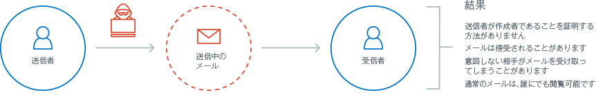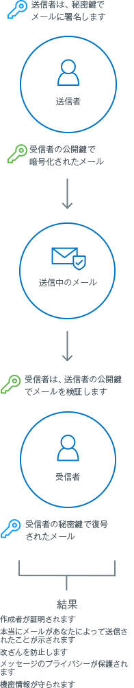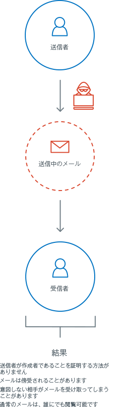 多くの組織では、電子メールが最も弱いセキュリティの突破口になっています。Web サイトや銀行取引と同様に、電子メールのデータは、送信者から受信者へと移動する間も保護されている必要があります。PKI 証明書は、電子メールのコンテンツを保護するだけでなく、送信者の ID を埋め込むことができる、安心の暗号化および認証ソリューションです。