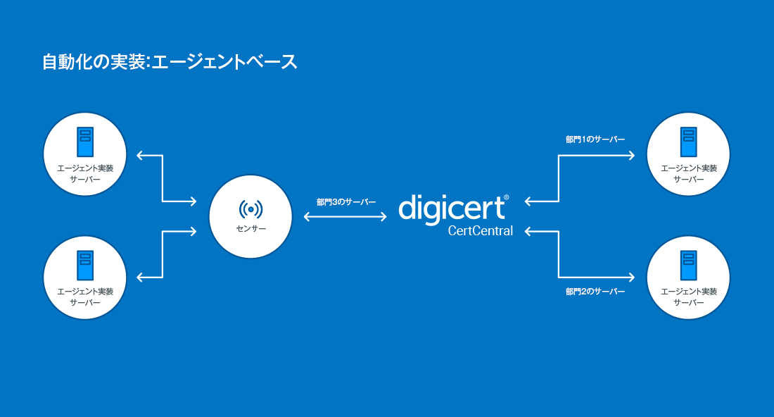 より複雑なネットワーク、アプライアンス、ハイブリッドクラウドでTLS証明書を運用しているエンタープライズのお客様はTrust Lifecycle Managerにて提供しているAutomation APIやDigiCertの提供するクライアントソフトウエア(Agent/Sensor)を活用いただくことで、より高度で、証明書管理機能が充実した自動化ソリューションの導入が有効です。