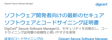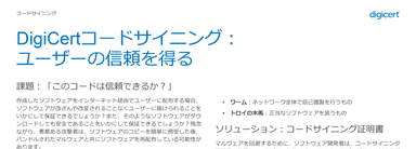 コードサイニングは、公開鍵(PKIの「PublicKey=公開鍵」)を使ってコードの作成者を特定し、第三者による改ざんを防ぐためにコードやライブラリを封印します。お客様の知的財産を保護し、ユーザーがアプリケーションをダウンロード、実行するときに、お客様のコードが警告を発しないことを保証する、最も信頼できる手法です。
