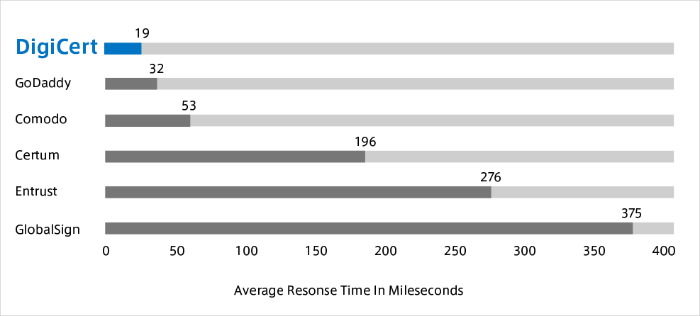 DigicertのOCSP(Online Certificate Status Protocol)サーバーは100%の稼働を保ち、競合他社に比べてレスポンスタイムは最大で4倍高速であることが示されています。