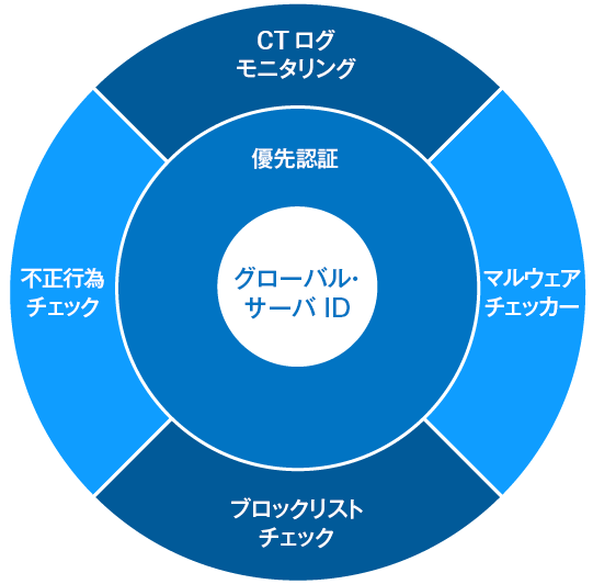 高度なセキュリティの包括的なソリューションによって、既知および将来の脅威から Web サイトを保護します。グローバル・サーバ ID には、証明書を超えた機能があります。動的なデジサートスマートシール、優先的な検証、マルウェアスキャン、CT ログモニタリング、脆弱性および PCI スキャン、ブロックリストチェック、不正行為チェック、耐量子コンピューター暗号ツールキットへのアクセスなど、まったく新しい機能を提供します。