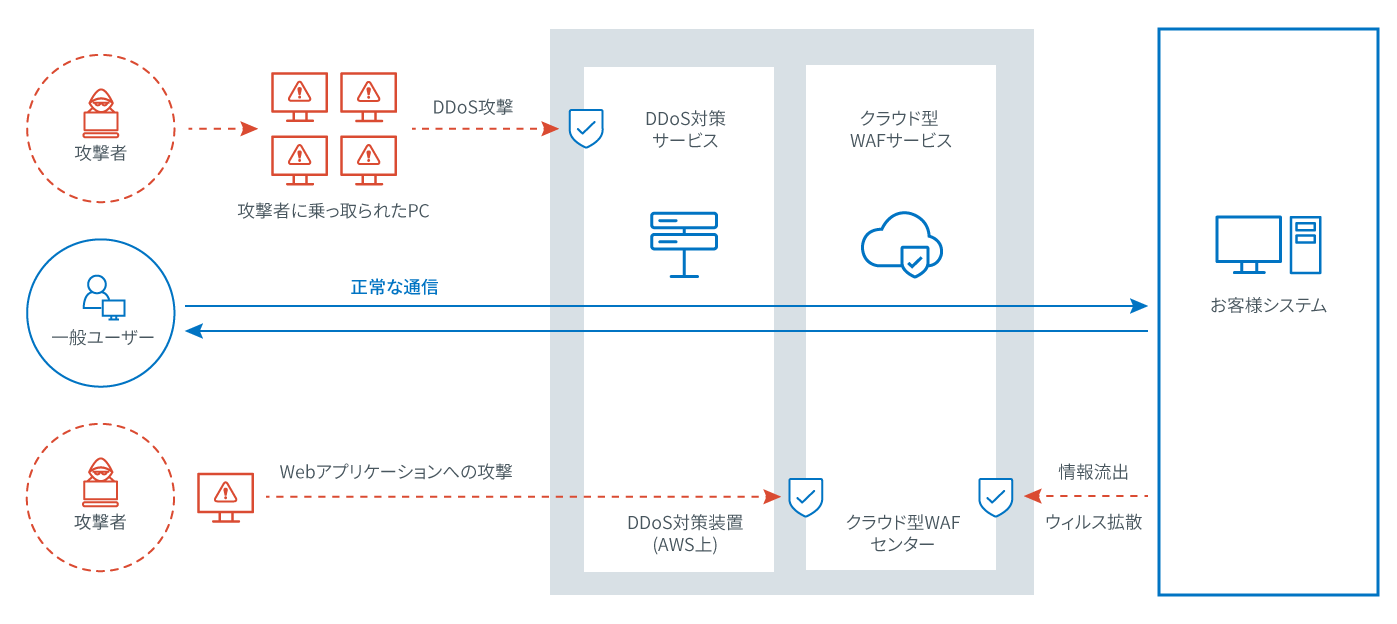 クラウド型WAF DDoS対策サービスは、世界中に配置されるAWSの高速なネットワーク上で監視/遮断の機能を活用して構築されるため、顧客の環境に近い場所に限らず、攻撃者により近い場所でDDoS攻撃を遮断します。そのため、正規ユーザによる通信への影響を最低限に抑えながら、DDoS攻撃のみを遮断することが可能です。