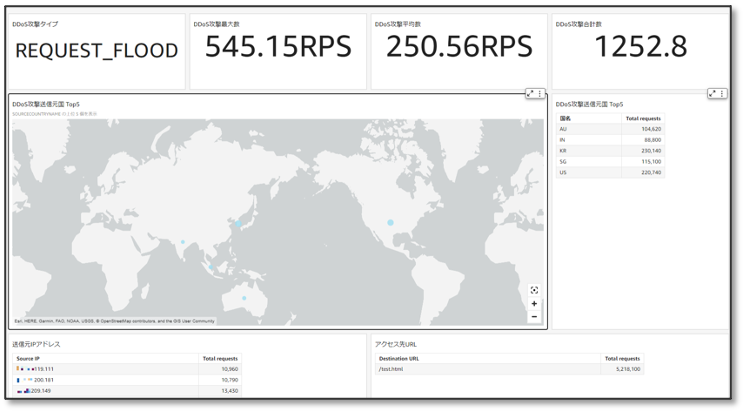 管理サイトでは、各DDoS攻撃に関する攻撃タイプや攻撃規模、送信元(IPアドレス/地域)や対象URLなどの情報を確認することができます。